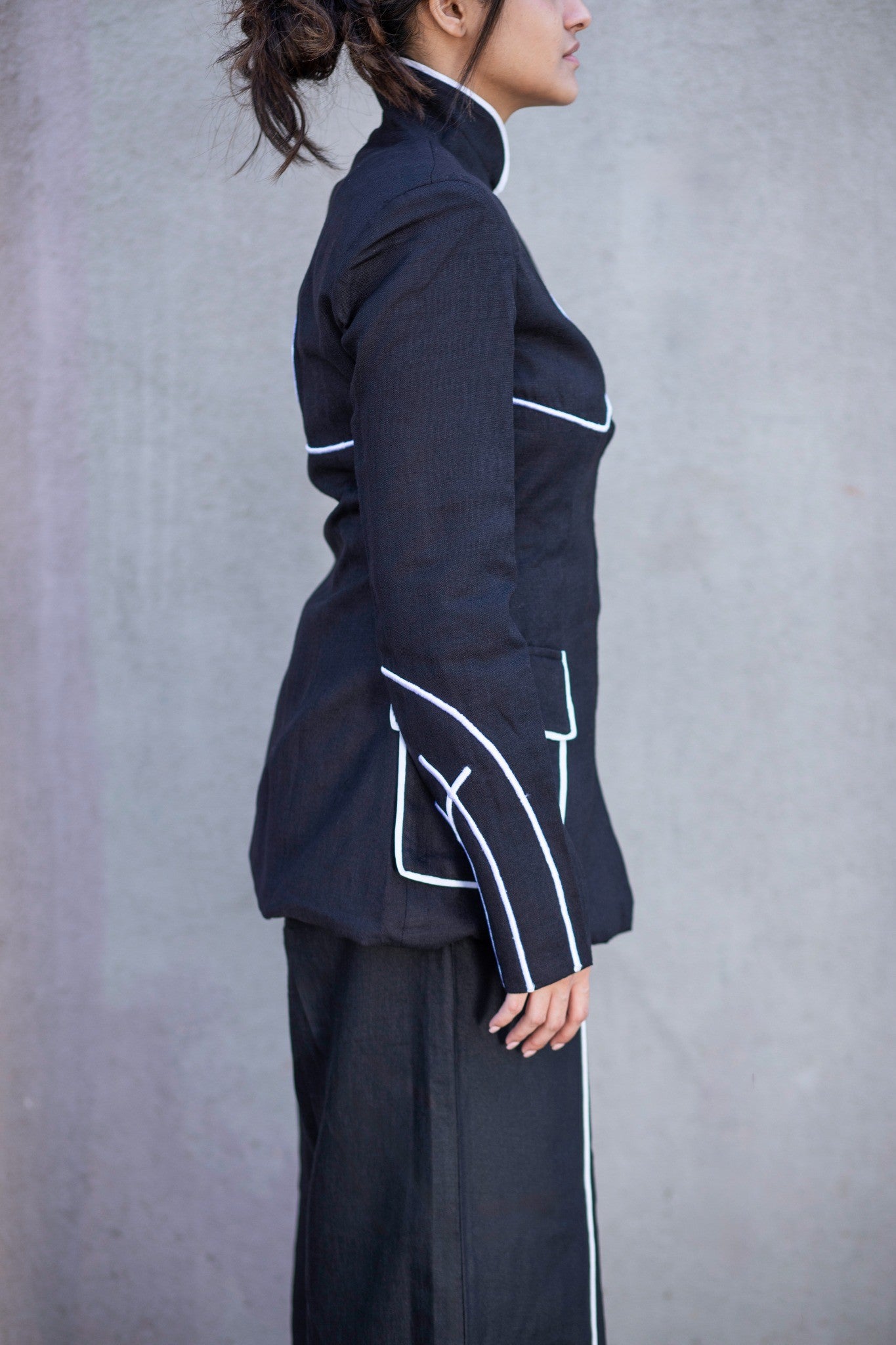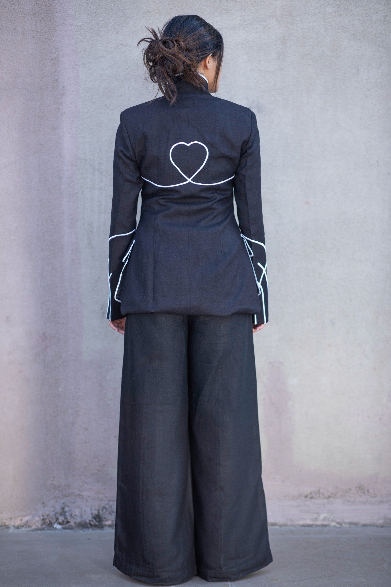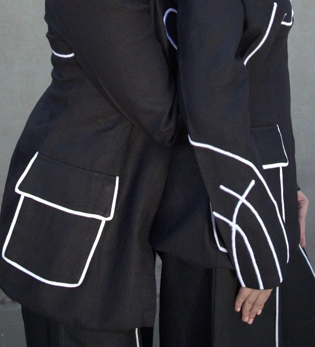 A blazer that wears like a memory—crafted in featherlight black linen, this relaxed silhouette blurs the line between tailored polish and effortless ease. At its heart, an intricate embroidered galaxy motif—drawn from the Antennae galaxies—symbolises cosmic connection, a quiet tribute to the unseen threads that bind us to those far away. Designed for movement, meditation, or a moment of stillness, it redefines the art of lounging or working with meaning woven in.