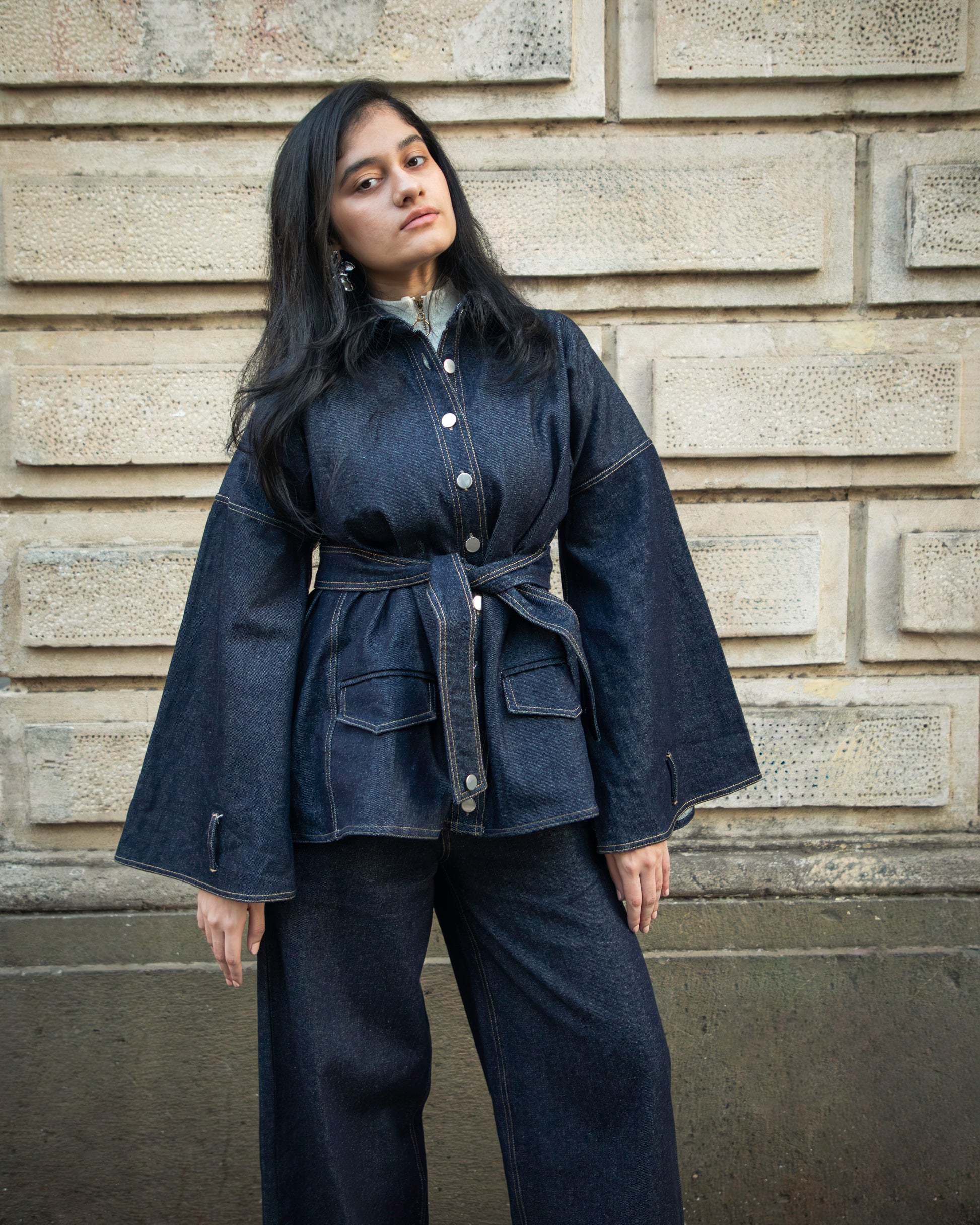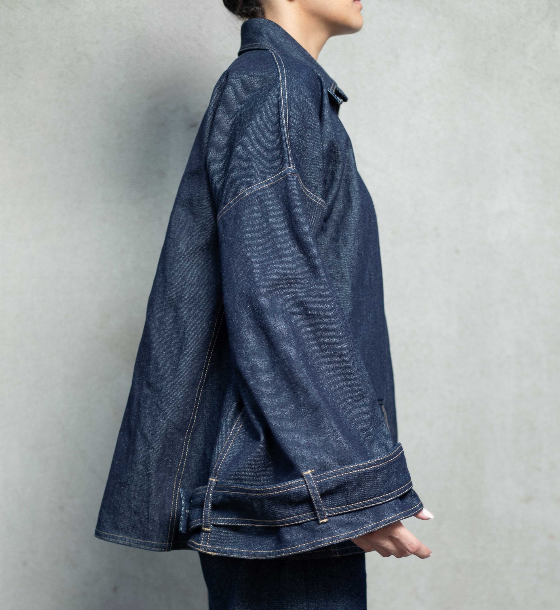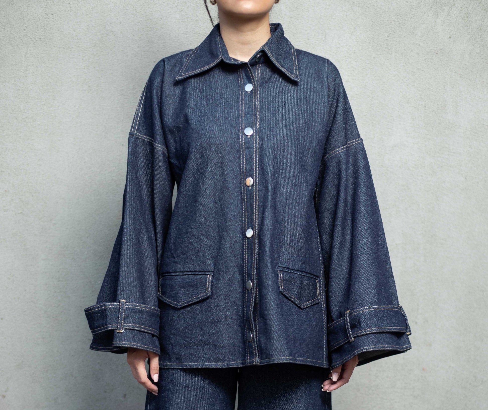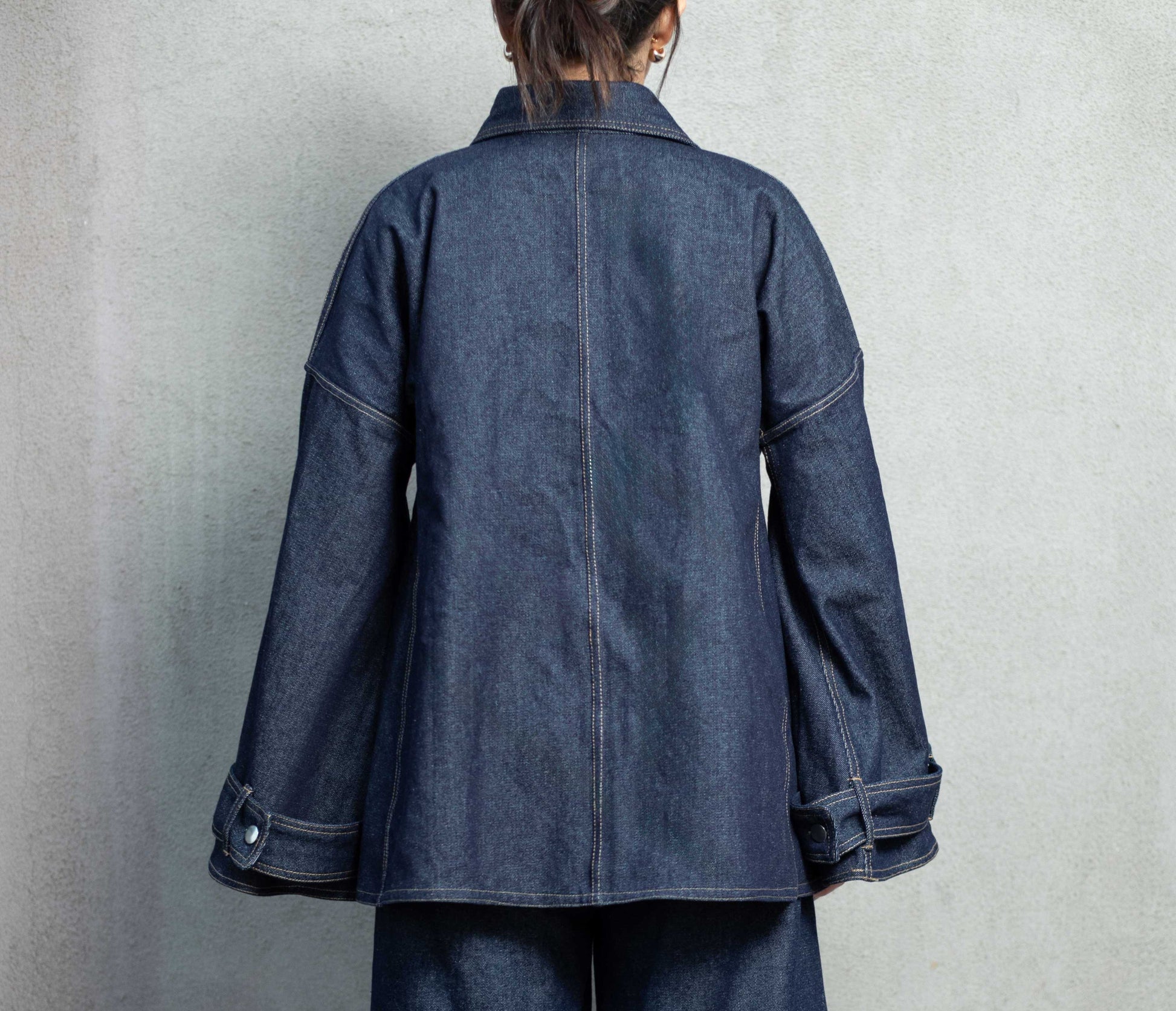 Where utility meets quiet drama. This sculptural 'Shacket' in raw indigo denim is all about proportion play—billowing sleeves, crisp tailoring, and exaggerated cuffs. A refined take on workwear, reimagined for city streets and beyond.