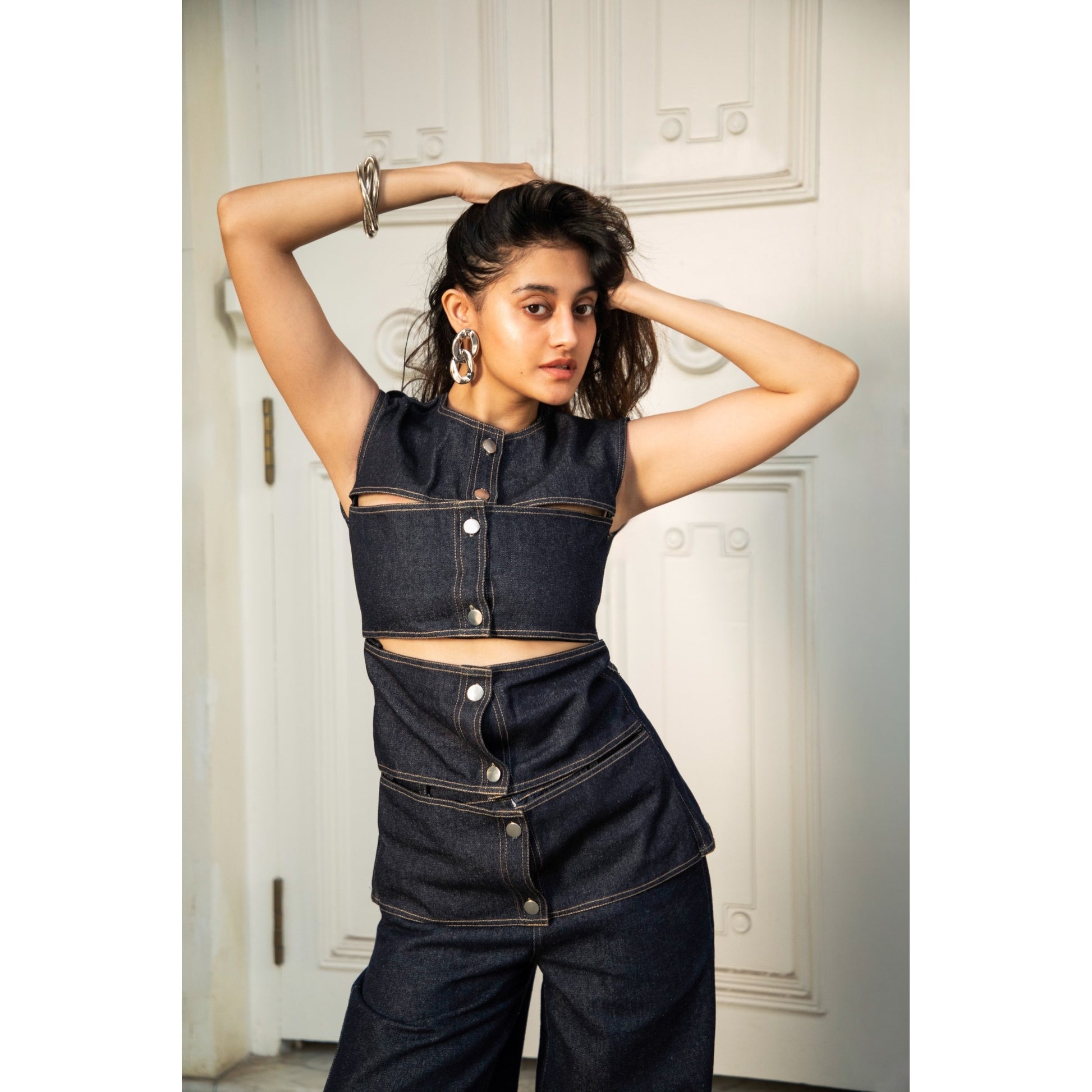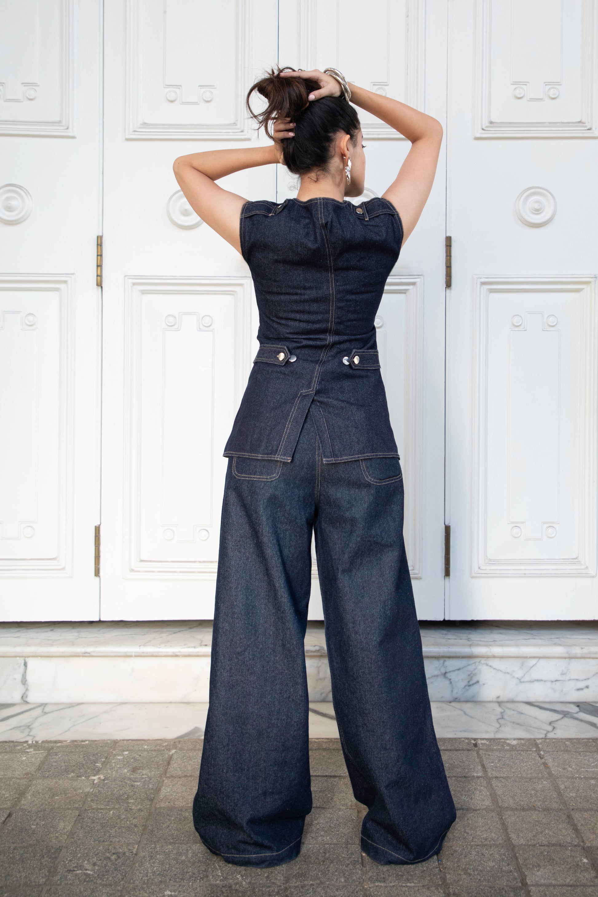Ré’s vest is precision-cut from structured raw denim in a sculptural, four-panel silhouette. The deep indigo hue adds sophistication, while clean lines and sharp tailoring give it a modern, utilitarian feel. Wear it solo or layered to bring architectural edge to everyday looks.