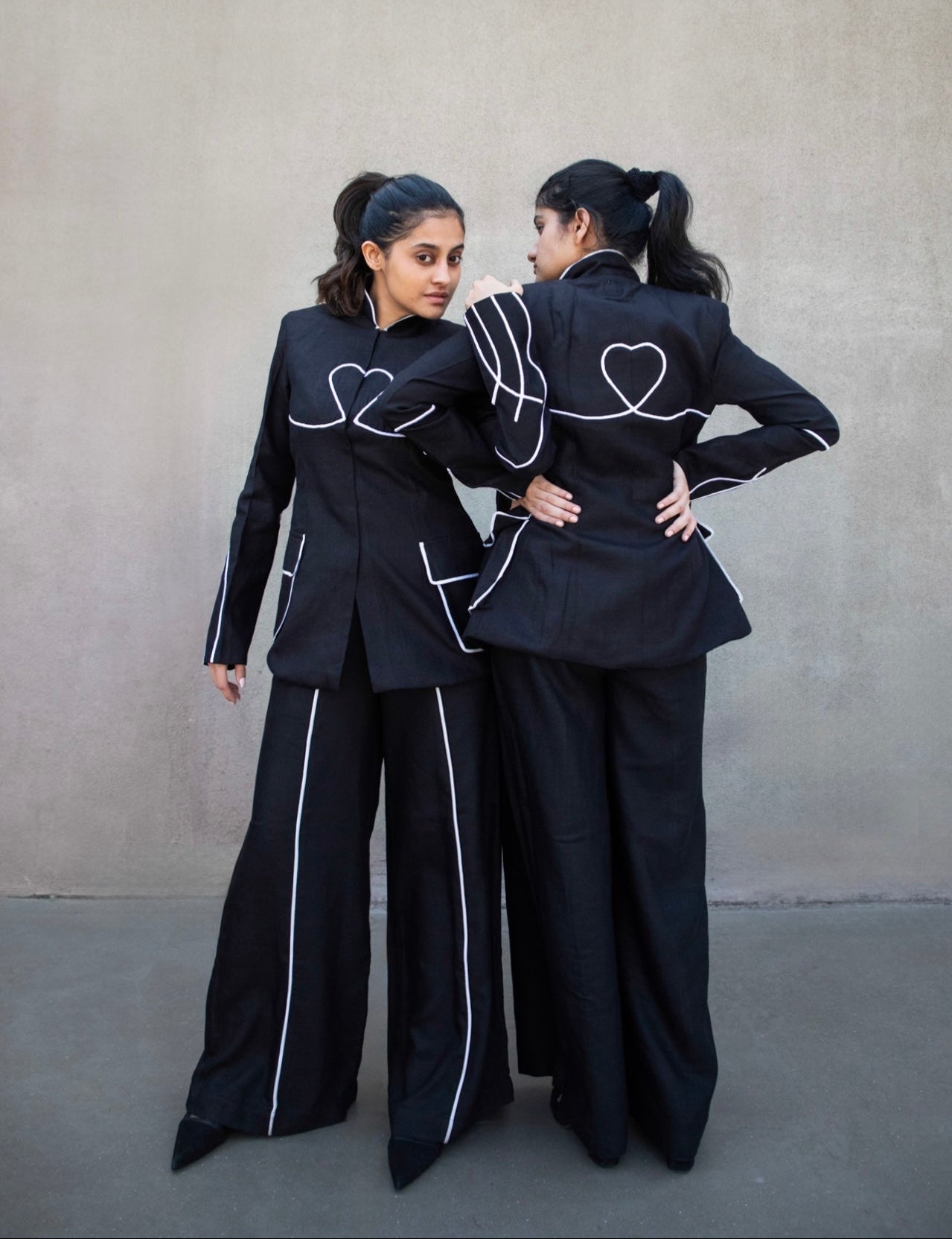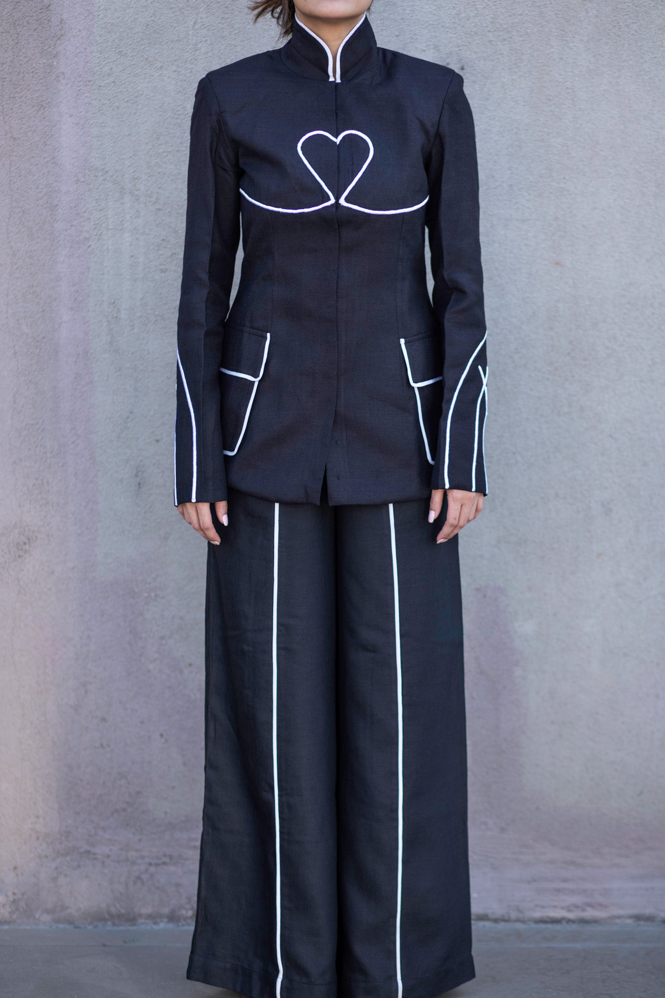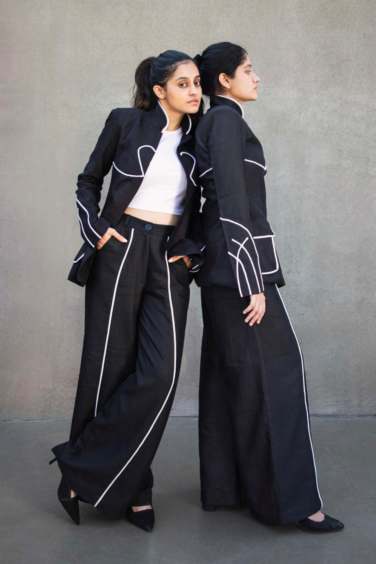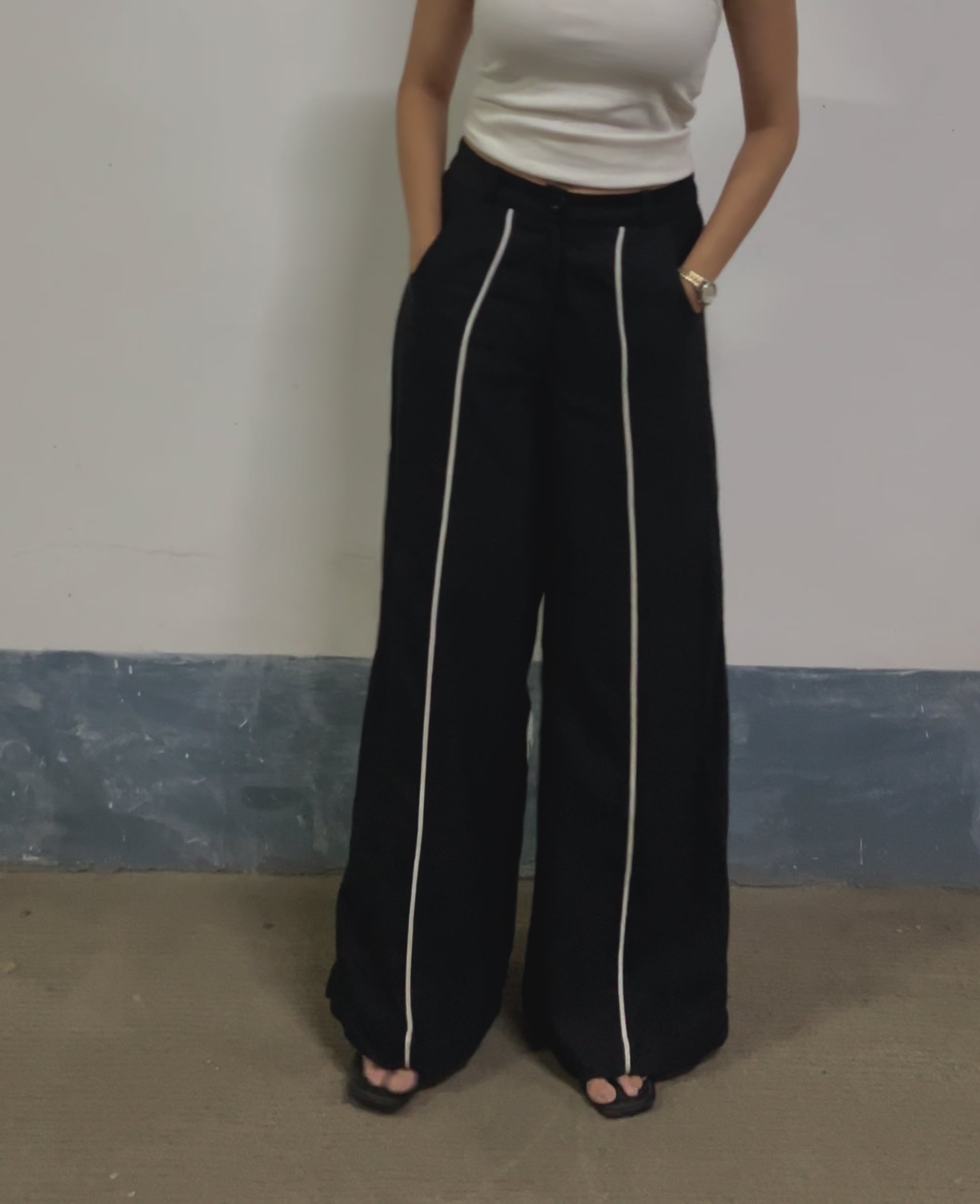 The Antennae wide-leg trousers are cut from airy black linen and defined by crisp white piping that sculpts the silhouette. High-waisted with fluid movement, they strike the perfect balance between tailored polish and ease.
